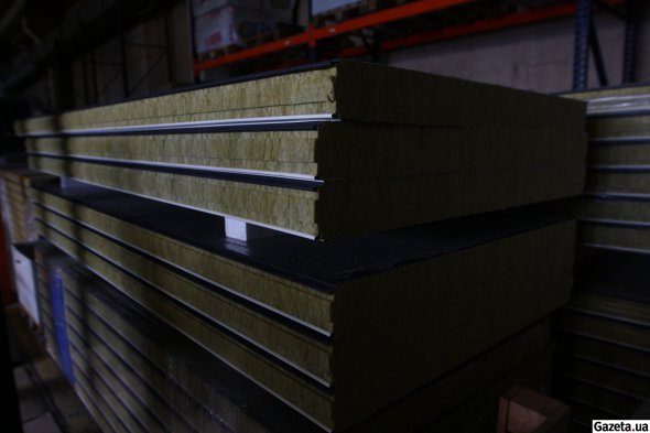 Високі панелі "обперлися" на стіну в кілька рядів, з обох боків обшиті сталлю. У розрізі видно жовтий щільний утеплювач. Їх виробники називають "сендвічами" через будову в кілька шарів.