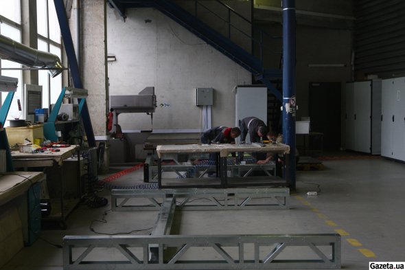У першому цеху під вікнами із сірої буди на тросах виїжджають металеві конструкції чорного кольору. Однакові квадратні рами хвилею котяться у сушильну машину, під якою тепле повітря струменить аж до підлоги. Деякі процеси фарбування виконуються автоматично, а жінка в сірому бомбері всередині кабінки вкриває чорною фарбою з розпилювача тонкі деталі.