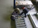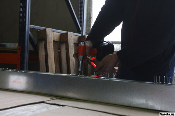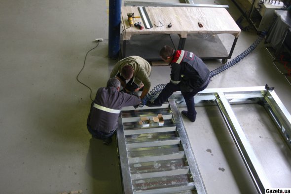 Трохи далі виготовляють металеві елементи для будинків – рами, кріплення, палі. Тут панує запах розпеченого металу. Пласкі чорні листи сталі лежать на підлозі біля автоматичних зварювальних апаратів. Вони схожі на печі з алюмінієвими блискучими витяжками нагорі.