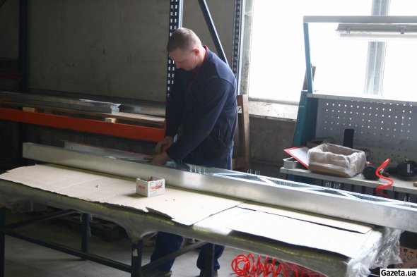 – У нас своя лінія оцинковки металу – гальваніка. У нас весь метал іде оцинкований. Це процес обробки металу для протидії корозії, – зупиняємося дорогою до цеху обробляння металу. – У нас своя лінія порізки лазером, нічого лобзиком не ріжеться. Усе, що потрібно просвердлити та продирявити виконується на спеціалізованому професійному обладнанні.
