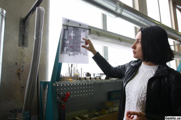 Керівниця моторно йде до станків, на яких розвішені листи з кресленнями й плануванням модулів. Показує зображення будинку із чотирьох блоків.