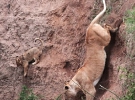 Але левиця старанно доповзла вгору й винесла маленького лева з прірви, після чого сіла облизувати перелякане дитинча.