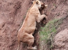 Почувши крик, його мати та троє левиць почали спускатись по вертикальній скелі.