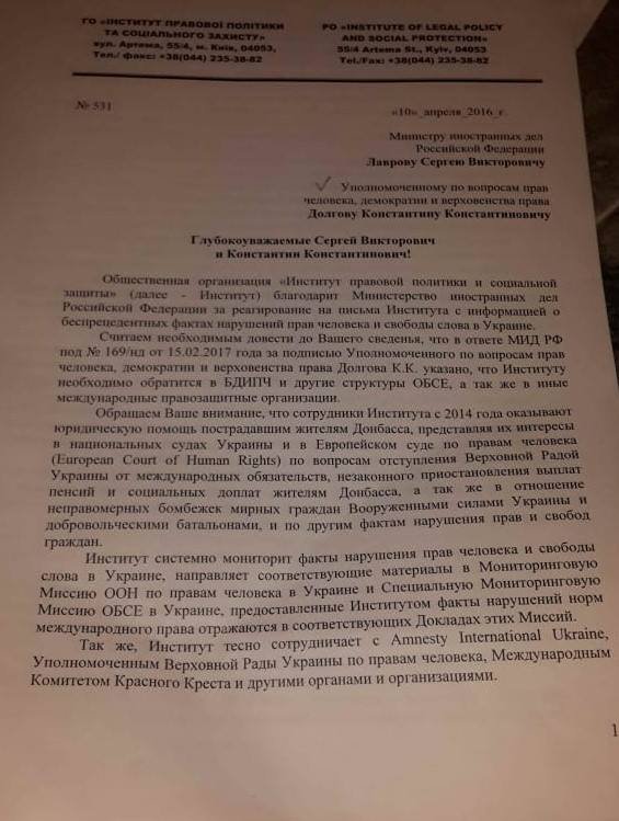 "Наші співробітники виявили лист до міністра закордонних справ держави-агресора Сергія Лаврова щодо необхідності активізації діяльності російських організацій в Україні", - йдеться в повідомлені.