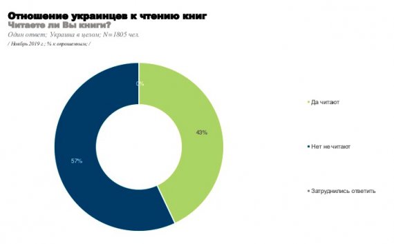 2019 року більшість українців практично не читали книг. Відносно регулярно читають книги 43% українців, а 57% сьогодні практично не читають.