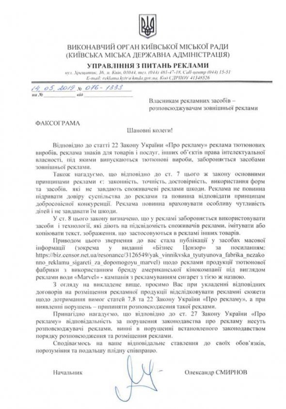 14 травня керівник Управління з питань реклами Київської міської держадміністрації Олександр Смірнов направив операторам столичного рекламного ринку лист, в якому фактично визнав рекламу цих сигарет незаконною. Він закликав усіх діяти за законом "Про рекламу" і припинити поширення реклами сигарет Marvel.