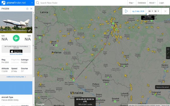 Український політик і кум президента Росії Володимира Путіна Віктор Медведчук на своєму літаку Falkon 900 з бортовим номером P4-GEM сьогодні вранці вилетів з Києва в напрямку Москви.