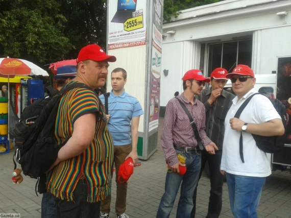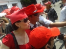 Близько 11.00 до групи молодих людей підходить ще кілька дівчат. Вони одягають високі червоні конуси з картону, з вирізаними дірками для очей. Чоловік тримає у руках пакет ще з десятком кепок. Деякі виглядають ще як новенькі, деякі вже потьмяніли, написи на них стерлися.
