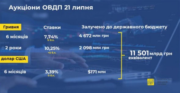 "Від розміщення 6-місячних паперів до державного бюджету було залучено 4,67 млрд грн, а від дворічних - 2,1 млрд грн. Середньозважена дохідність 6-місячних ОВДП склала 7,74%, в той час як 2-річних - 10, 25%", - йдеться в повідомленні.