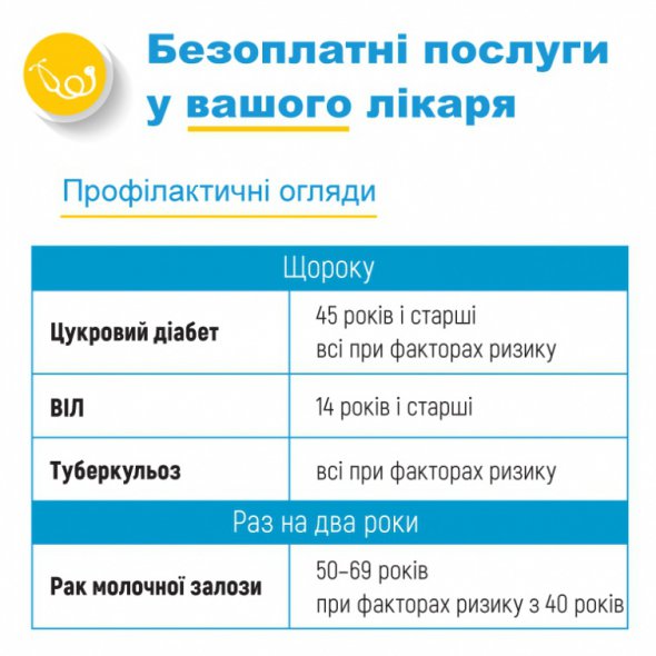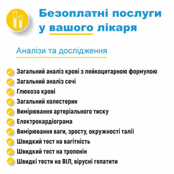Інші дослідження та аналізи можна буде отримувати в закладах спеціалізованої допомоги за направленням вашого лікаря.