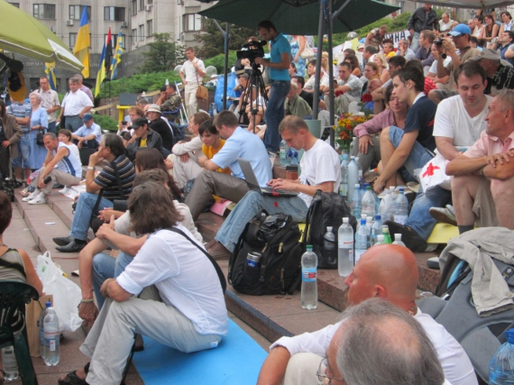 "Вчора носили воду беркутівцям, міліціонерам і працівникам ДАІ, а вони брати не хочуть. Один навіть обізвав нас. Більше я до них не піду, - каже 19-річна Ірина. Вона має на голові вінок з диких ромашок. Волосся заплетене у косу. - Вчора один бізнесмен на джипі привіз 4 кілограми нарізок і мороженого сала. Багато людей підносять воду. За день випивають сотні літрів".