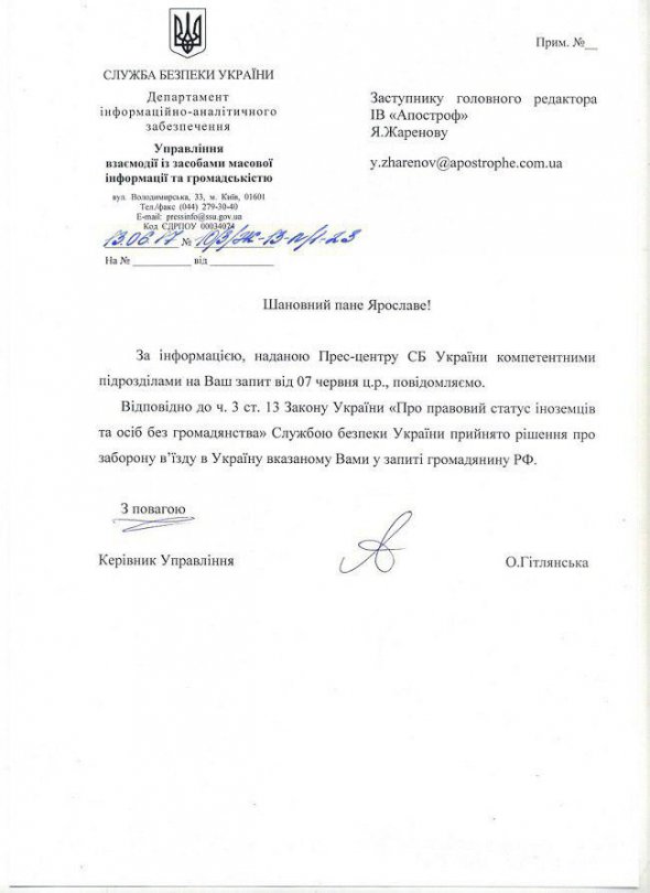 "Згідно з частиною 3 статті 13 Закону України "Про правовий статус іноземців та осіб без громадянства", Служба безпеки України прийняла рішення щодо заборони в'їзду в Україну вказаному вами в запиті громадянину РФ", - йдеться в документі СБУ.