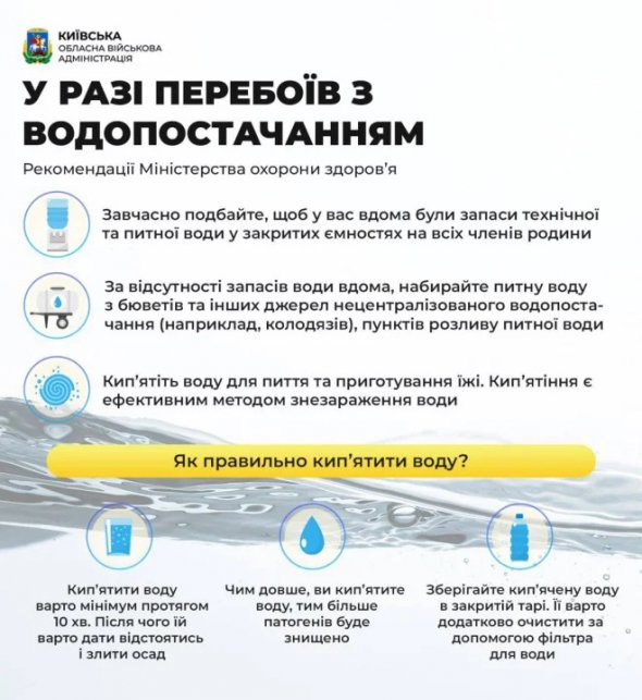 Радять мати запас води для всіх членів родини у закритих ємностях, за відсутності – набирати воду у бюветах, колодязях чи пунктах розливу. А також кип'ятити воду для пиття і готування, щоб знезаразити її. Рекомендації Міністерства охорони здоров'я опублікувала Київська обласна військова адміністрація.