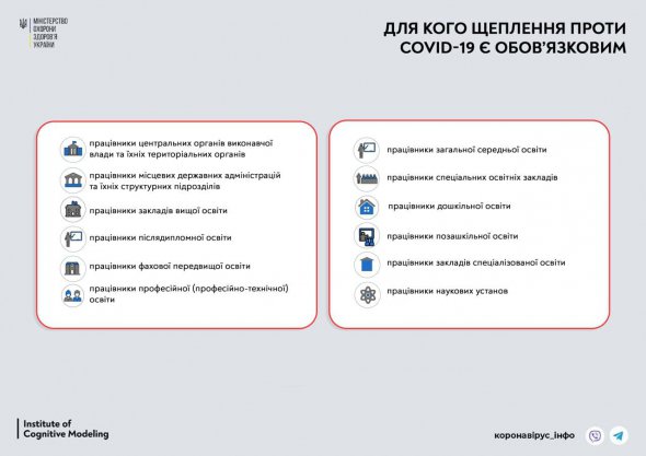 Обов'язковій вакцинації підлягають працівники центральних органів виконавчої влади та їхніх територіальних органів, місцевих державних адміністрацій та структурних підрозділів, закладів вищої, післядипломної, професійної, загальної середньої, початкової, позашкільної та дошкільної освіти та наукових установ.