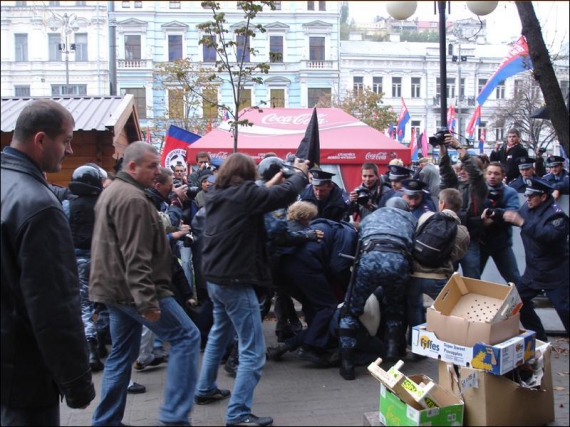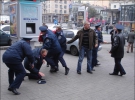 Під час сутички працівникам міліції також дісталося трохи стусанів. Правоохоронець піднімає з тротуару свого кашкета, якого він втратив під час бійки.