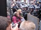 Дві радикально налаштовані жіночки намагаються прорватися через кордон правоохоронців. Коли бійки вже закінчилися, активістки наполегливо лупили палицями по металічній огорожі. Їм все ж таки не вдалося достукатися до міліціонерів.