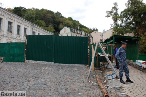 На столичному Подолі реконструюють Андріївський узвіз, там повністю поміняють та укріплять дорогу. Обіцяють прокласти нову каналізацію. Будівельники вже поставили уздовж дерев'яний паркан, він починається згори, навпроти № 22. Машини вулицею не пропускає міліціонер, всіх завертає. Для туристів та торговців залишилась тільки пішохідна доріжка.