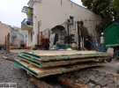 Через паркан видно: бруківку згребли на купу, багато піску. Посеред вулиці - величезна яма з водою.