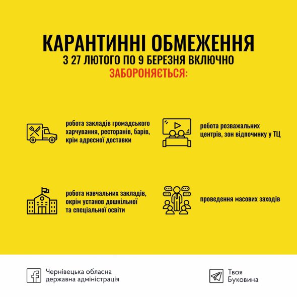 З 24 лютого Україна повернулася до адаптивного карантину. Він триватиме до 30 квітня. Від початку тижня в Івано-Франківській, Чернівецькій та Закарпатській областях планували призупинити роботу розважальної інфраструктури і всіх закладів громадського харчування.