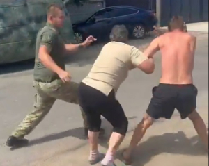 На кадрах, які поширили в мережі, видно, як чоловіка у військовій формі б'є іншого чоловіка, а також штовхає жінку, яка його захищає. При цьому один із військових тримає в руках предмет, схожий на тростину для ходьби.
