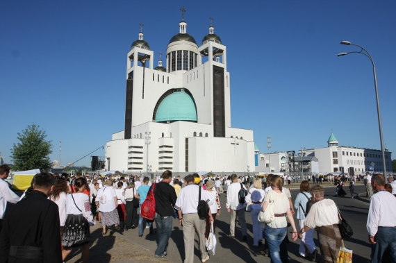 "Ми поки не знаємо скільки тут людей, але більше 20 тисяч точно, - каже біля жовтої палатки 20-річна волонтерка Надія. Реєструє паломників, котрі прибувають на освячення Патріаршого собору Воскресіння Христового, Української греко-католицької церкви в Києві 18 серпня. Цього дня, греко-католики святкують 1025-річчя Хрещення Русі.