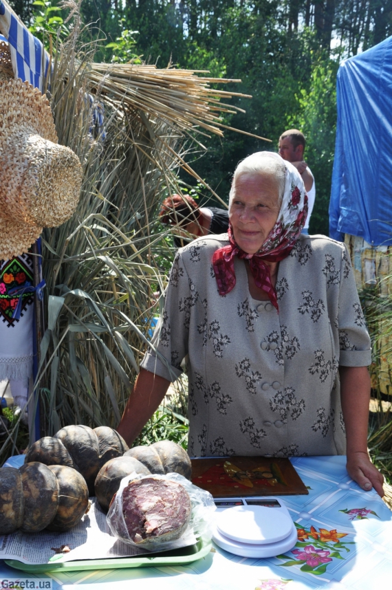 Софія Данилова із села Озеро зважує мацик - в'ялене м'ясо по-поліському, яке готують у північних районах області. Шматки свинини з прянощами не піддають термічній обробці, а сушать у промитому міхурі.