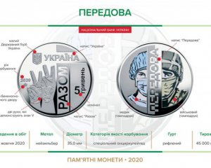 "На аверсі монети розміщено: угорі – малий Державний Герб України та напис УКРАЇНА; праворуч на матовому тлі напис РАЗОМ (вертикальний) та номінал монети 5 ГРИВЕНЬ (вертикальний напис); ліворуч на дзеркальному тлі: дві руки, які демонструють знак V, поширений жест, що означає перемогу та мир, рік карбування монети – 2020 та логотип Банкнотно-монетного двору Національного банку України. На реверсі монети зображено образи медика та військового (кольорові, використано тамподрук), між якими вертикальний напис ПЕРЕДОВА", - написали в повідомленні Національного банку.