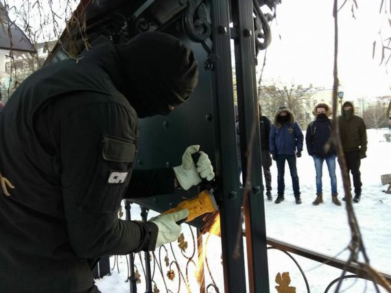 "Прийшли до самозахопленій Моспархатом землі у розкопок Десятинної церкви. Проводимо демонтаж", - написали представники.