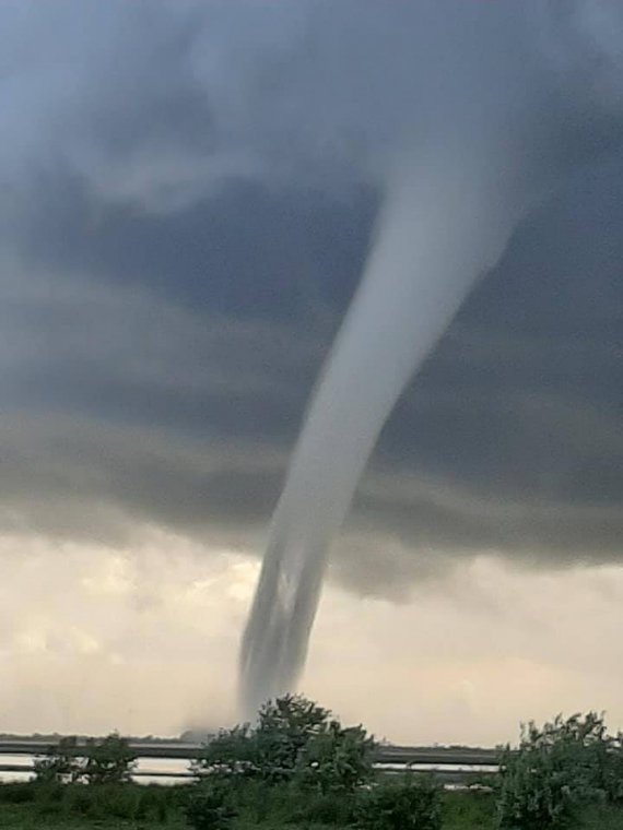 "Ще один смерч значних розмірів, імовірно, водяний, помітив Дмитро Рижко в селі Хорли Херсонської області 3 червня. На фото видно, що вихор почав формуватися над водною поверхнею і потім уже вийшов безпосередньо на узбережжя півострова Горький Кут", - написав метеоролог.