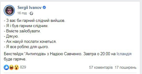 Частину діалогу з Савченко Іванов опублікував на своїй сторінці в Facebook. Так журналіст показав бекстейдж програми, в якій є інтерв'юером.