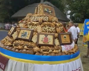 Рекордсмен із назвою "Коровай миру" заважив на 614 кг 750 г. Шматочки короваю розвезуть Україною - в дитячі будинки та госпіталі, де проходять лікування воїни АТО.