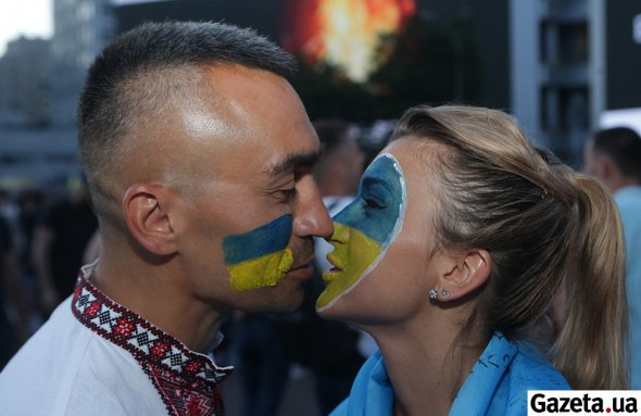 Між натовпу бігають торговці атрибутикою. За маленький прапор України просять 50 грн, за великий – більше 150 грн. Кілька дівчат розмальовують обличчя охочим синьо-жовтими кольорами.