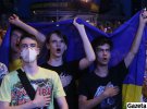 Кінець першого тайму у фан-зоні зустрічають криками "Україна!". Так реагують на гру збірної на останніх хвилинах. Наші пішли уперед та змусили англійців відбивати.