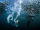 "Косяк сардин" - головна премія, а також перше місце в категоріях "Місце" і "Дія". Під час міграції вздовж Дикого берега в ПАР сардини стають жертвами дельфінів і олуші. Хижі птахи стежать зверху за полюванням дельфінів, а потім з 30-40-метрової висоти пірнають під воду і хапають сардин.