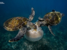 "Частування медузою". Спеціальна премія в категорії "Дія". Фотограф Скотт Портеллі виявив черепаху, що поїдає медузу, в Байрон-Бей (Австралія). Пізніше до неї приєдналася друга. Тварини влаштували щось на зразок перетягування каната.