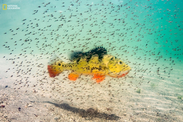 "Горда матуся". Друге місце в категорії "Портрети тварин". Самка плямистого окуня-павича охороняє мальків у прісноводому озері, Майамі, штат Флорида.