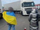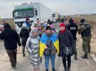 На світлинах видно як жінки з українськими прапорами стоять перед вантажівками і не дають проїхати.
