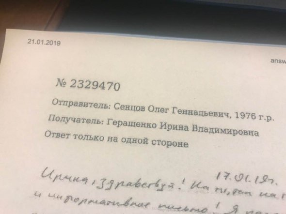 Ірина Геращенко отримала листа від українського політв'язня Кремля Олега Сенцова.