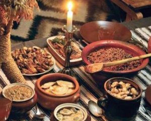 Увечері, коли на небі з'явиться перша зоря, родинами збираються за святковим столом. Подають лише пісні страви: кутю та узвар, вареники з капустою, млинці, квасолю та квашені овочі. Після вечері всі кладуть свої ложки в одну миску, а зверху – хлібину, "щоб хліб родився".