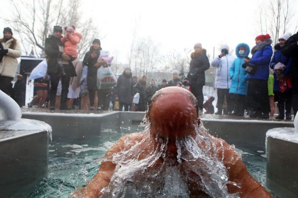 Чоловік пірнає в крижану воду на Водохреща у Харкові 19 січня. Вважається, що в цей день вода набуває цілющих властивостей.