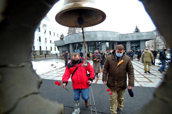 У Києві 21 січня люди несуть квіти до дзвону пам'яті під час пам'ятної церемонії в Міністерстві оборони України. Того дня була шоста річниця, як українські бійці-кіборги залишили Донецький аеропорт. Небайдужі прийшли вшанувати пам'ять загиблих у боях за летовище.