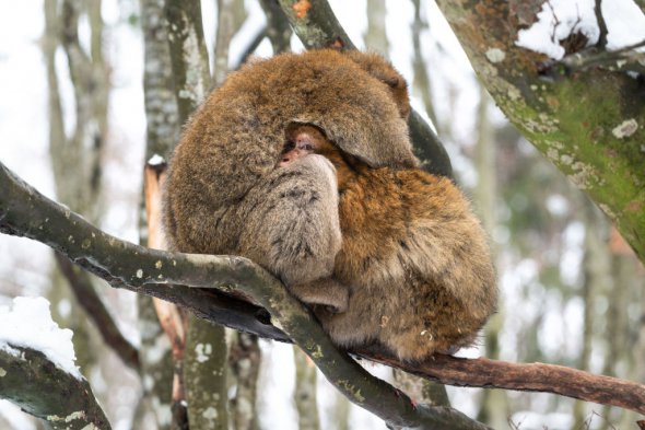 18 січня дві макаки Барбарі вмостилися на дереві й притискаються одна до одної в природоохоронному парку в німецькому Баден-Вюртемберзі, щоб зігрітися.