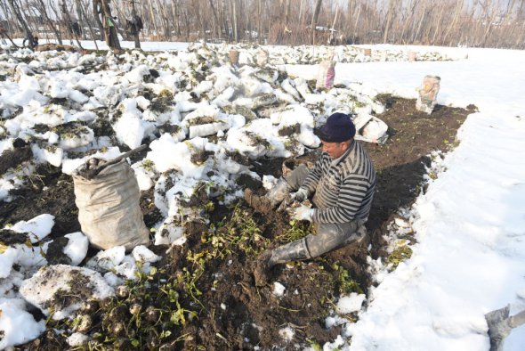 Фермер збирає редьку із засніженого поля в індійській Срінагарі 20 січня.