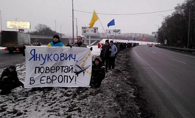Близько 200 активістів самооборони Майдану проводять на Бориспільській трасі акцію "Янукович - повертай літак в Європу". Мітингувальники вишикувалися вздовж дороги, що веде до аеропорту Бориспіль, якою сьогодні має проїхати президент України.