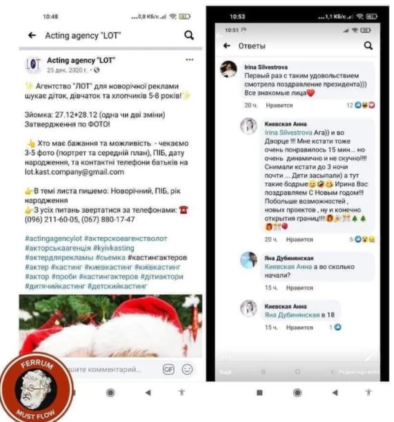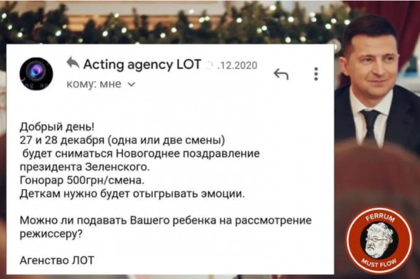 Нібито, для тих батьків, котрі зацікавились, Лот в особистих повідомлення уточнював, що буде "зніматися Новорічне привітання президента Зеленського. Діткам потрібно буде відігравати емоції".