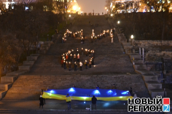 На 35-й день Євромайдану в Одесі, його учасники провели акцію на Потьомкінських сходах. Люди вишикувалися в слова "МИ Є" та запалили бенгальські вогні, а нижче на сходах розтягнули 12-метровий прапор України.