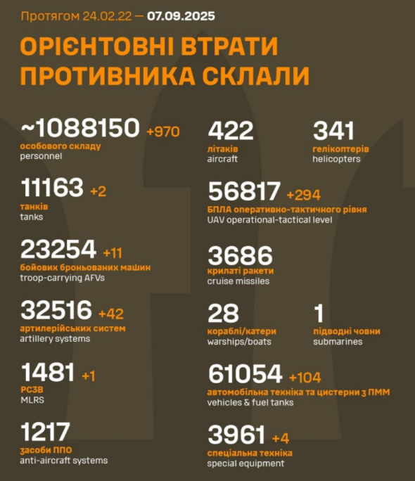 Зокрема українськими воїнами знищено два танки, 11 бойових броньованих машин, 42 артилерійські системи, одну РСЗВ, 104 одиниці автомобільної техніки та автоцистерн і чотири одиниці спецтехніки та чотири одиниці спецтехніки.