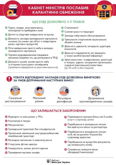 В Україні відсьогодні, 11 травня, послаблюють карантинні обмеження. Таке рішення було ухвалене урядом напередодні.