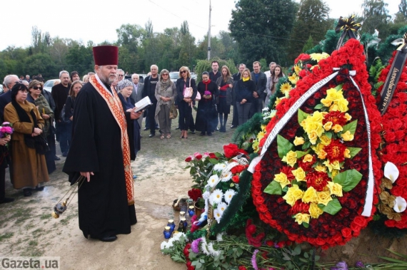 Біля могили більше десятка свічок, вся вона обкладена живими квітами. Люди намагаються підпалити воскові свічки, що їх тримають в руках, але свічки одразу гасить вітер.