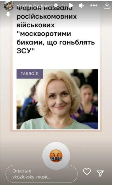 Співак Віталій Козловський, який захищає Україну у лавах ЗСУ, поділився на своїй сторінці в Instagram висловлюванням Фаріон, додавши до нього злий емодзі.